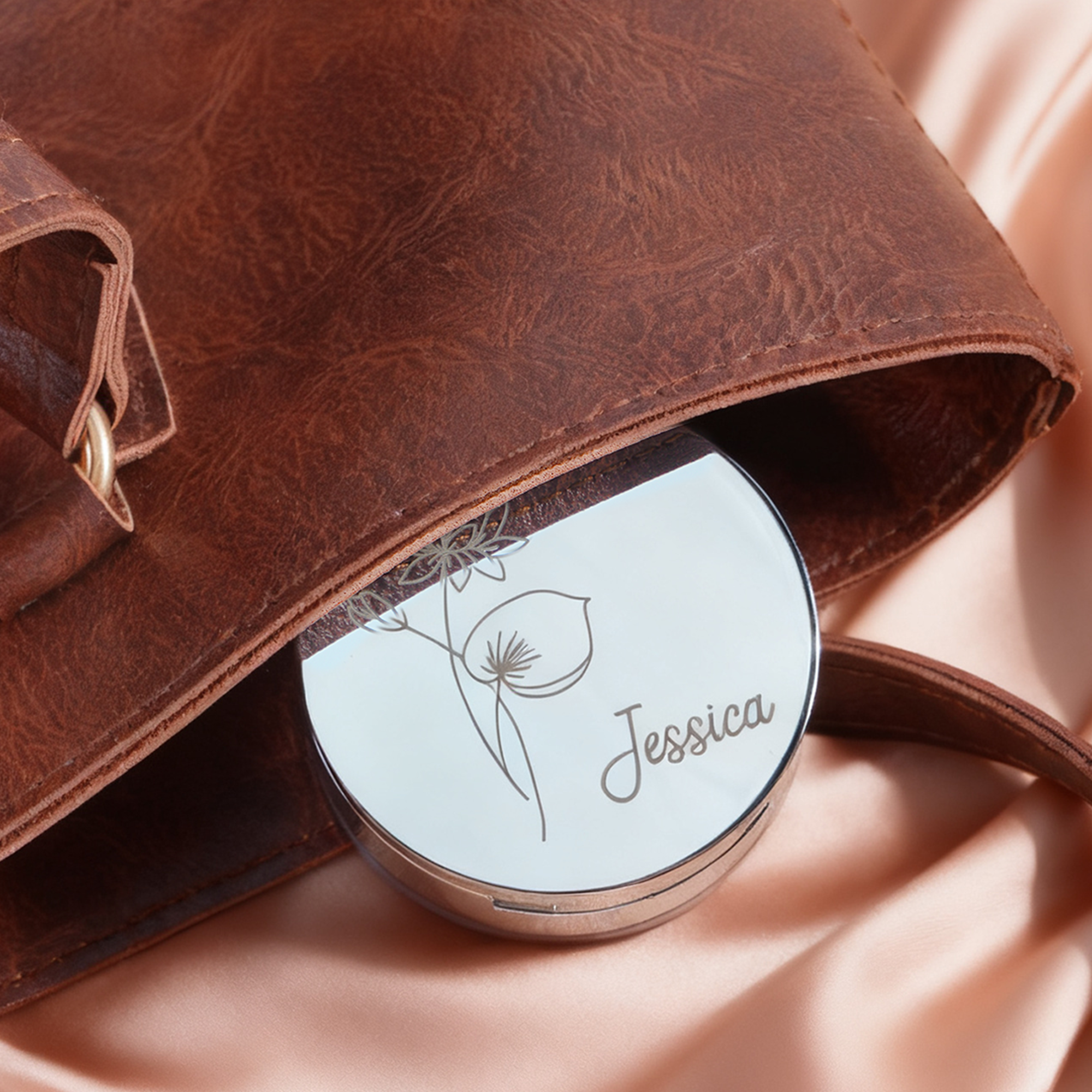 Personalized Design - This elegant powder box can be customized with a name and features beautiful birth flower designs, making it a unique and thoughtful makeup accessory. Each compact has a soft powder puff for easy application and a built-in mirror for on-the-go touch-ups.
