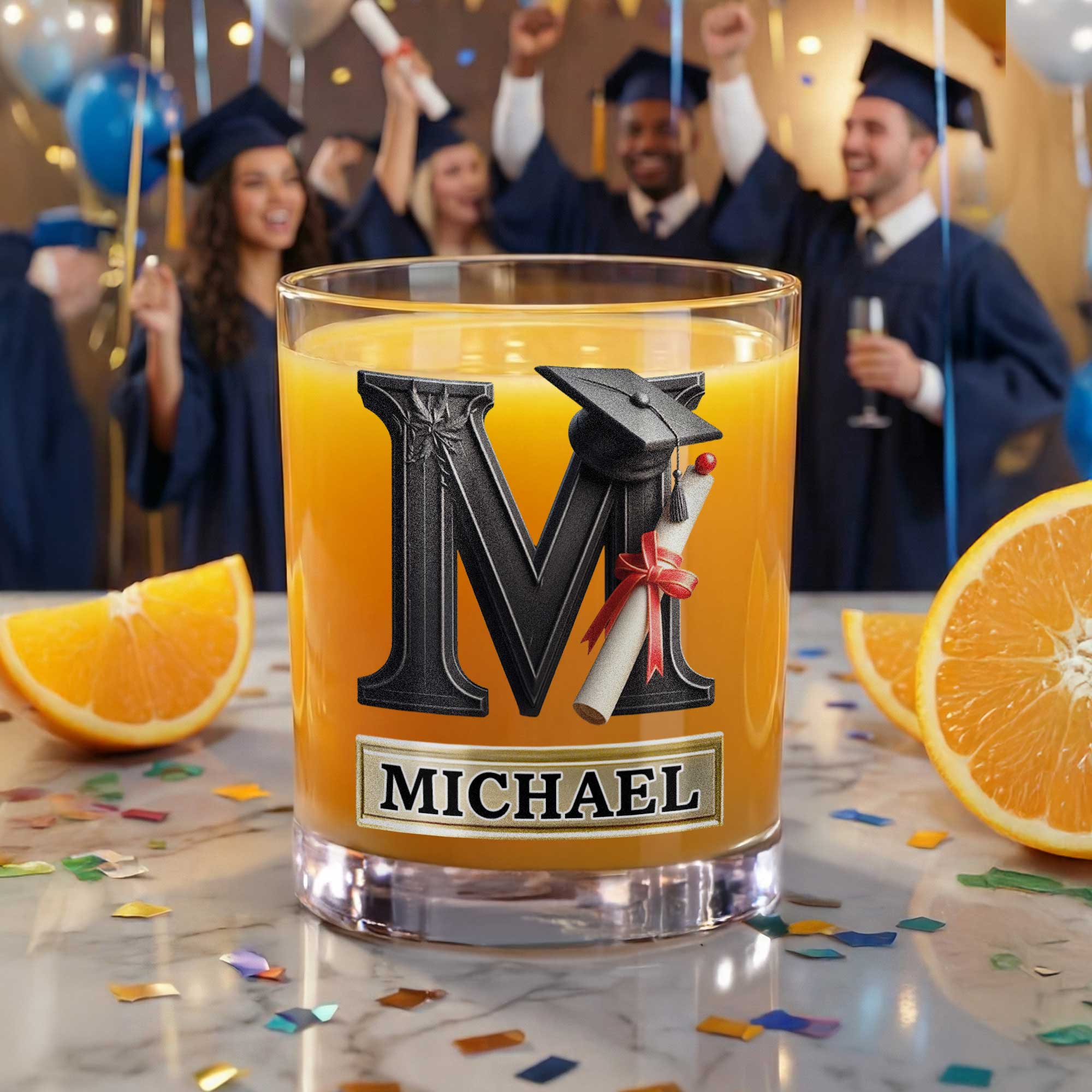 Graduation Cap Alphabet Design - The glass features a bold alphabet letter topped with a graduation cap, symbolizing achievement, growth, and lasting memories. The classic old fashioned shape offers a balanced, comfortable feel that whiskey drinkers and wine lovers appreciate.